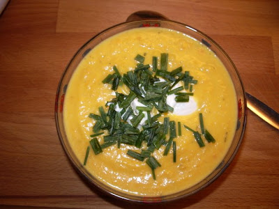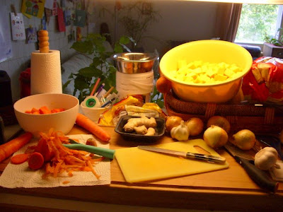 Und in der Kaufhalle gabs Kuerbis... Letztes Jahr hab ich keinen gekriegt und mir fest vorgenommen, dass ich dieses Jahr besser suche. Denn einmal im Jahr muss sie sein, die superleckere Kuerbissuppe, mit der die Lieblingsweiber mich vor Jahren zum allerersten Mal zum Kuerbisessen gekriegt haben. Zurueck zu hause gings denn auch gleich los, mit viel Zwiebel, Knobi und Ingwer sowie selbstgezogenen Chilies.