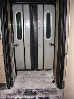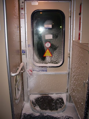 Überraschend war auch, dass wir in Pieksemäki ankamen bevor der andere Zug abfahren sollte. Der war denn auch das Goldstück der Reise und hat Erinnerungen geweckt... So ein richtig stabiler, zu dem man ordentlich Treppen hochsteigen muss und wo die Türen noch nicht automatisch aufgehen und die Sitze mir keine Schmerzen in Nacken und Rücken verursachen, der beim Fahren vielerlei Geräusche macht und beim Anfahren kräftig ruckelt, der ausserdem vielerlei Gerüche (oder Gestänke?) zu bieten hat,... Und in dem an jeder Verbindungsstelle zwischen den Wagons IM ZUG Schnee liegt. Nostalgie!!!